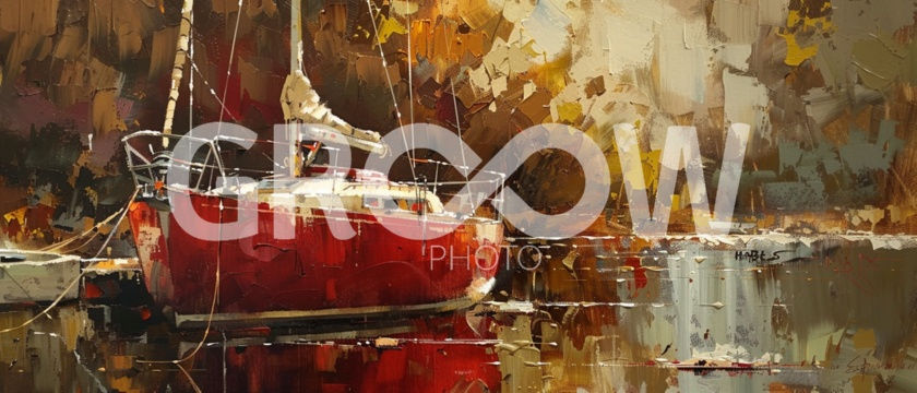 Keywords: barco de vela, rojo, pintura, navegación, aventura, capitán, marinero, remos, mar enbravecido, Sailing boat, red, painting, navigation, adventure, captain, sailor, oars, rough sea.