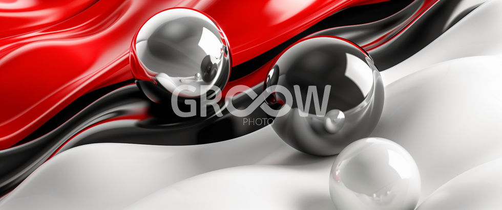 Keywords: abstracto, pliegues en cascada, esferas, metálicas, rojo, gris, blanco, negro, reflejos brillantes, abstract, cascading folds, spheres, metallic, red, grey, white, black, shiny reflections.